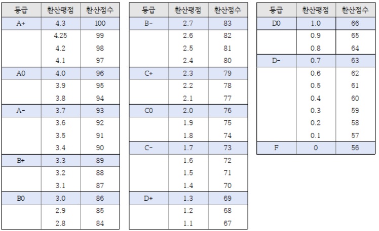 3. 성적평가는 원점수를 사사오입하여 본교 학칙(아래 표)에 따라 등급 부여됩니다.
